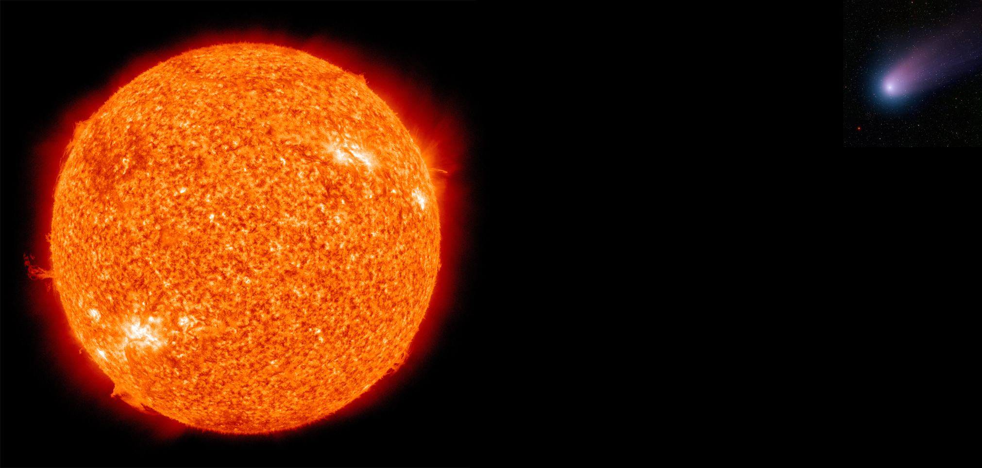 This cartoony image is, in fact, to scale. That’s not comet ISON, of course–it’s Comet NEAT from 2004–but a comet’s coma (the bright, but diffuse cloud that surrounds the tiny nucleus) really can grow larger than Jupiter, and comets really can survive passing that close to the Sun, even though they’re made of ice.