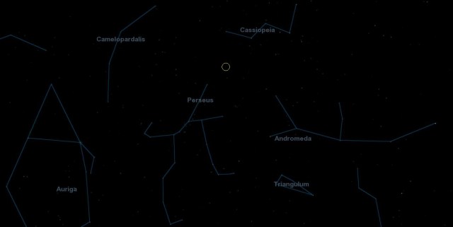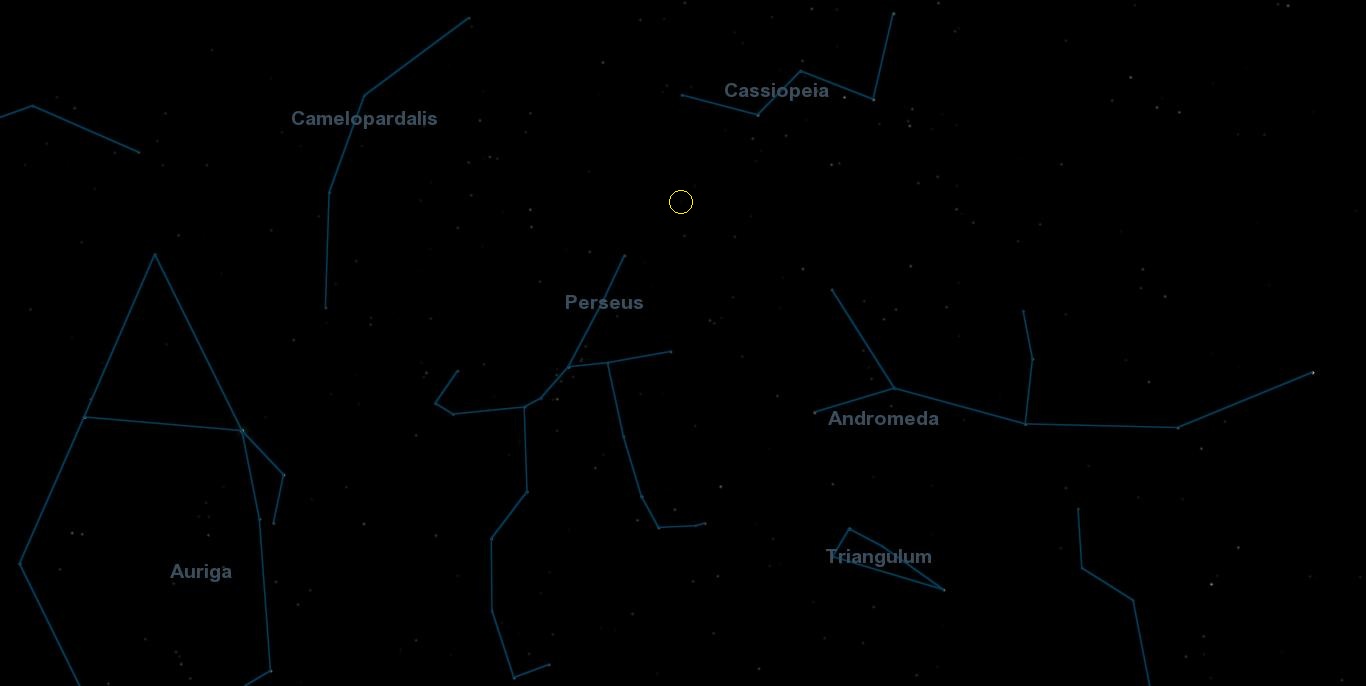 Take note of the yellow circle beneath the well known W-shape of Cassiopeia. You can find the spot in the real sky by following the line of the second and third stars of Cassiopeia. Look there from a dark place, and you can see there are two fuzzy spots side by side. If you look through binoculars, you can see that the spots are made of stars, something like this: