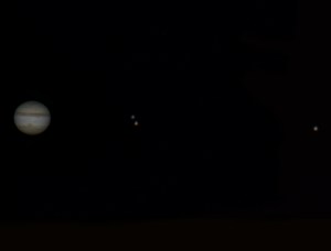The first thing you’ll notice about Jupiter, if you look at it through binoculars or a small telescope, is that it has moons. You can usually see some or all of the four large Galilean moons laid out in a line with Jupiter, and if you watch from night to night, you can even see them move.