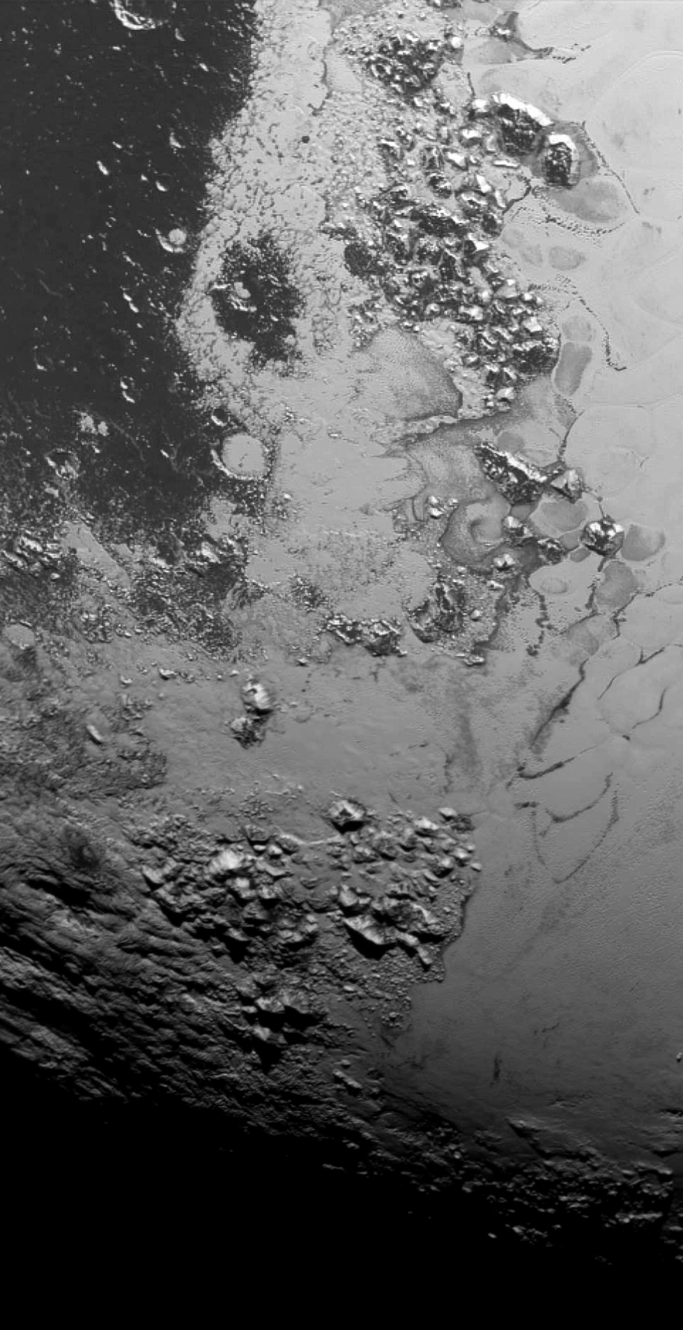 That is a close-up of the southwest part of Tombaugh Regio, also known as “the Heart”. You’ll definitely want to click to see the full-size version. We see two mountain ranges, one in the north and one in the south, both the equal of the American Rockies–which appear to be plateaus of water ice sticking up about the crust. To the east are plains of bright carbon monoxide ice, while to the west are dark, cratered lowlands, probably covered with methane ice and tar.