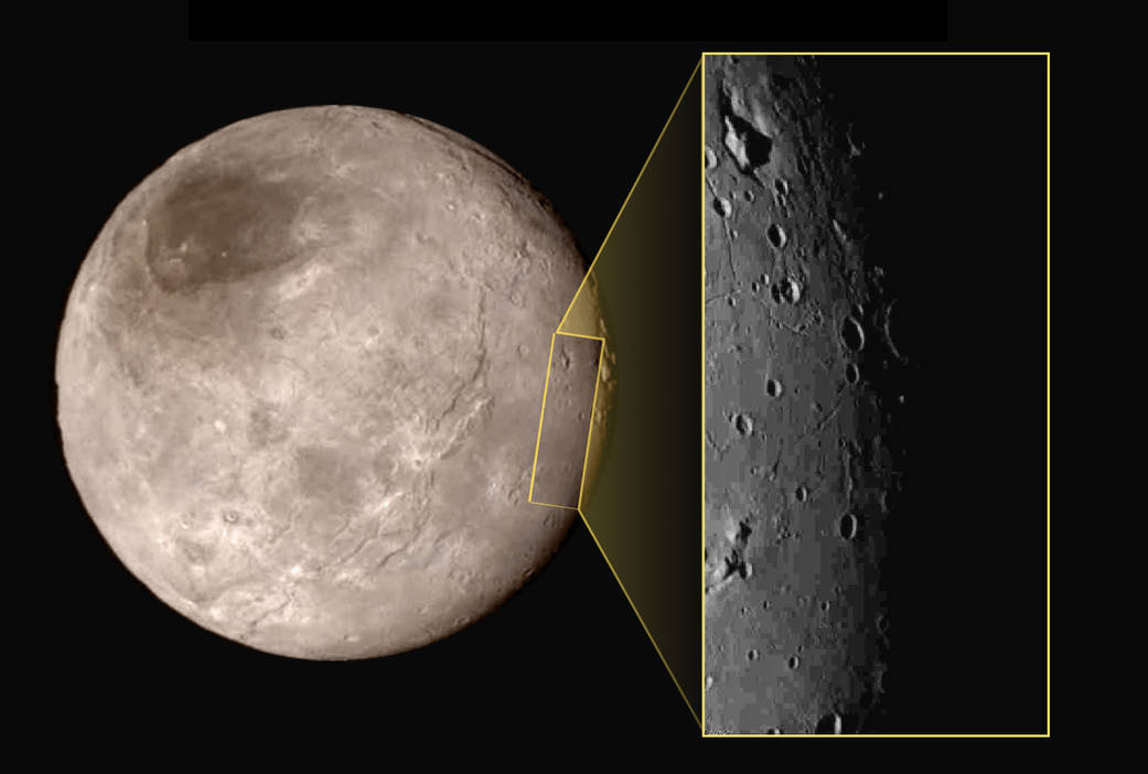 Astronomers got a big surprise when they took a close look at Pluto’s big moon, Charon. That’s a mountain that appears to be surrounded by a moat. Nobody really knows what it is. My guess is that it’s some kind of weird volcano or some kind of weird crater–or maybe both on top of each other.
