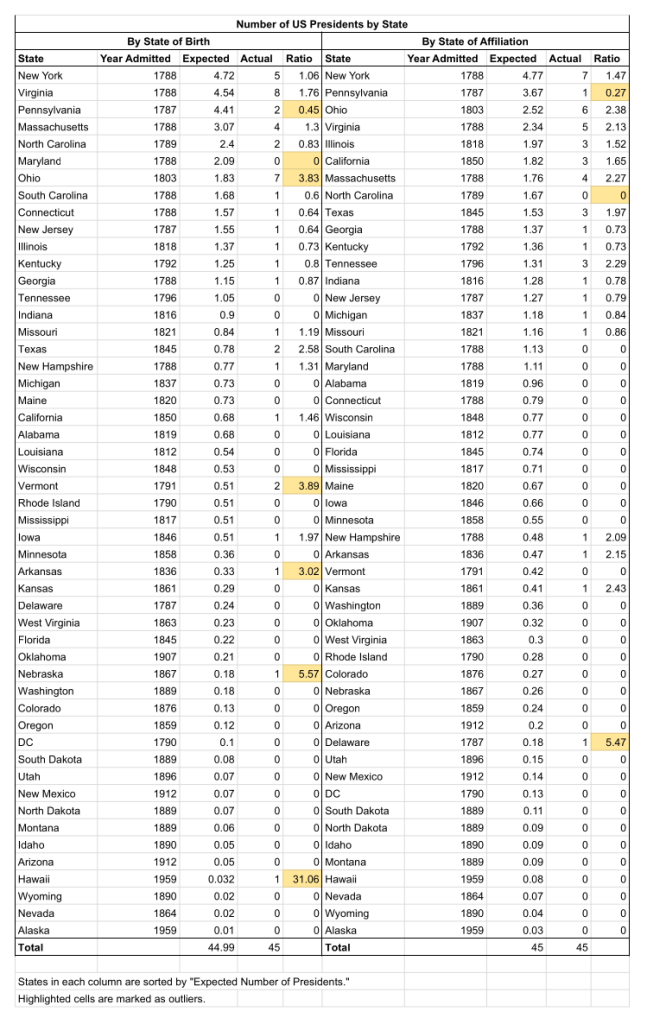 So which state is the best at producing Presidents based on where they lived? Well, once again, any small state that manages to produce any President is going to get a leg up, and in this case, the highest number goes to Biden’s home state of Delaware, outperforming expectations by a factor of five and a half. Among the large states, the outliers are Pennsylvania, which now claims only one President (Buchanan) and North Carolina with zero. (Maryland is also still at zero, but it’s further down the list and less remarkable.)