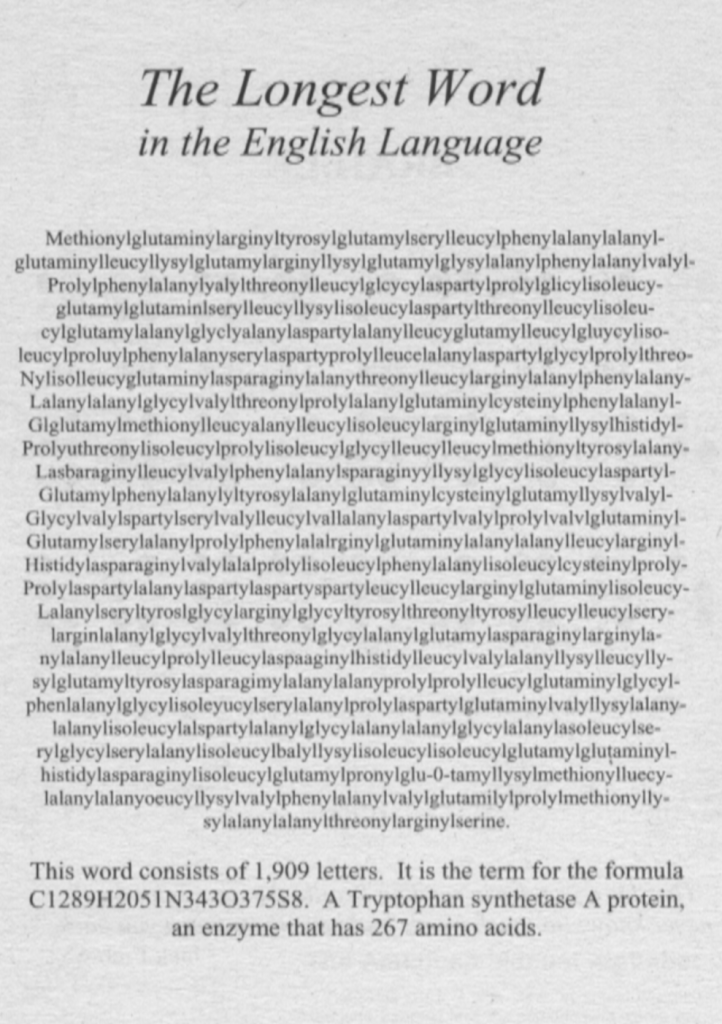 Tryptophan synthase A is sometimes said to be the longest word in scientific literature, but Ross Pomeroy at RealClearScience showed that this is not the case. In no scientific paper was the “full chemical name” of this protein ever published. And why would they? They have a perfectly serviceable name in “tryptophan synthase A.”