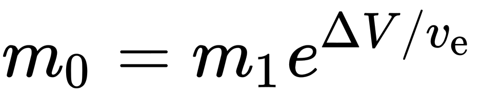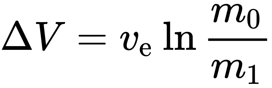This is the rocket equation, discovered by Russian physicist Konstantin Tsiolkovsky in 1903. (Although British mathematician William Moore also figured it out a century earlier.) It says that the change in velocity, or delta-v, that a rocket is able to make is proportional to its exhaust velocity (an intrinsic property of the fuel and the design of the engines) and the logarithm of the ratio of “takeoff” mass (m0) to “dry” or “final” mass (m1)—in other words, how much more the rocket weighs with fuel than without.